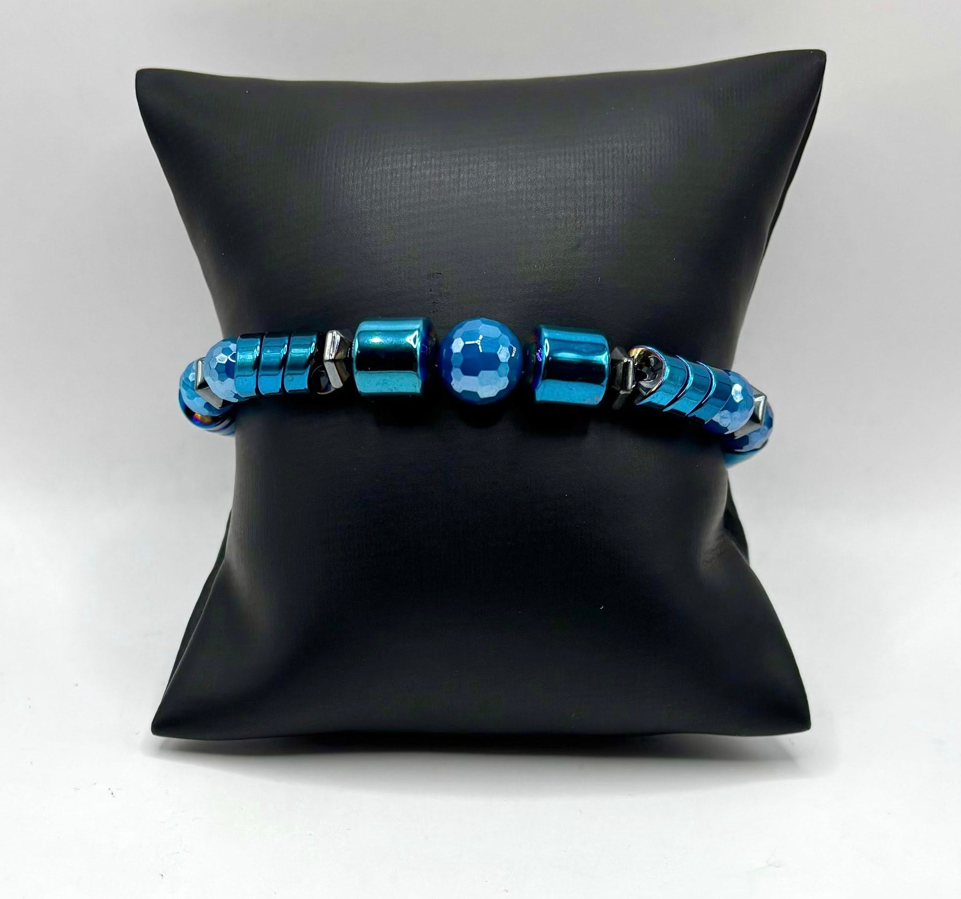 The metallic blue cylindrical and disc-shaped beads are Blue Hematite, which is natural hematite that has been electroplated to achieve a reflective, steel-blue finish.
