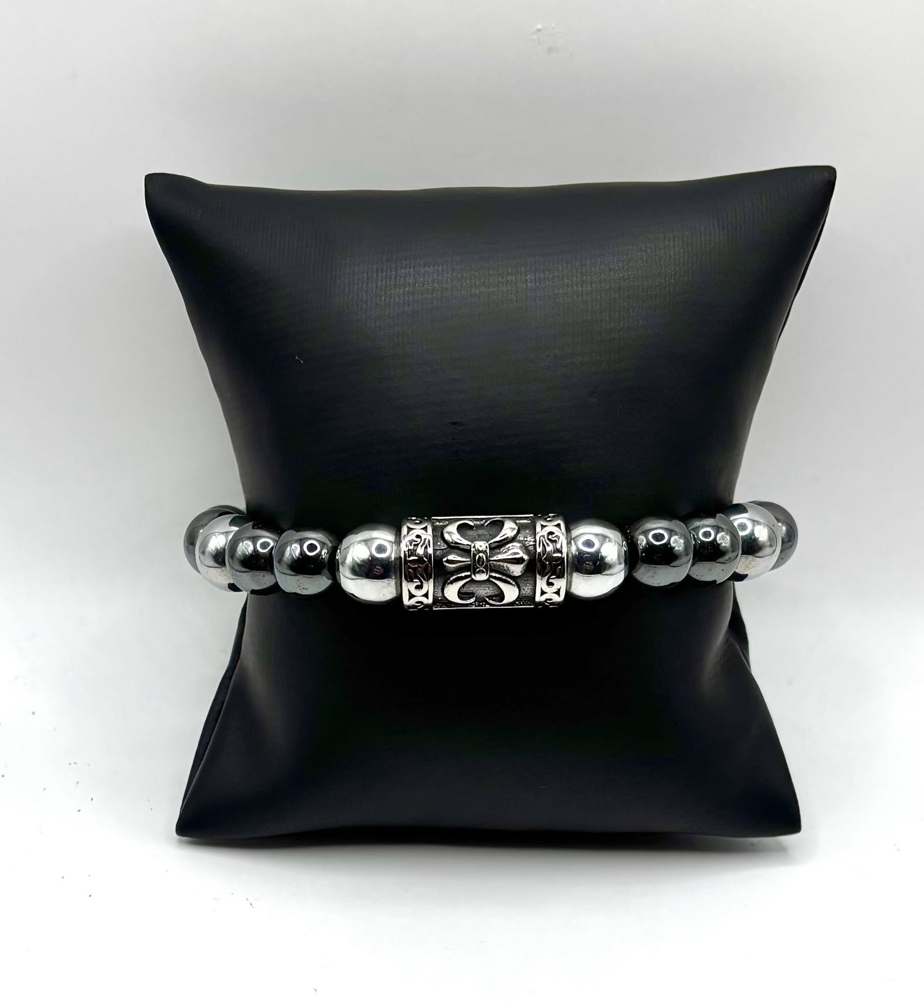 The metallic silver-gray beads with a mirror-like shine are a signature of Hematite, a naturally occurring iron oxide mineral.