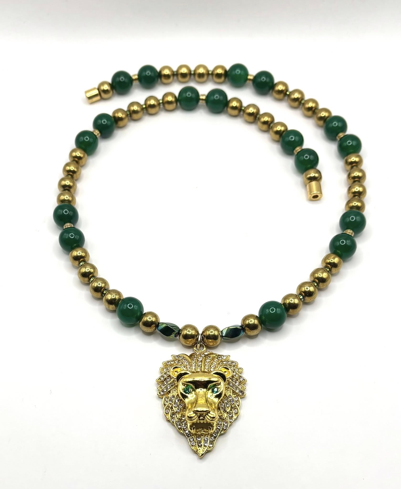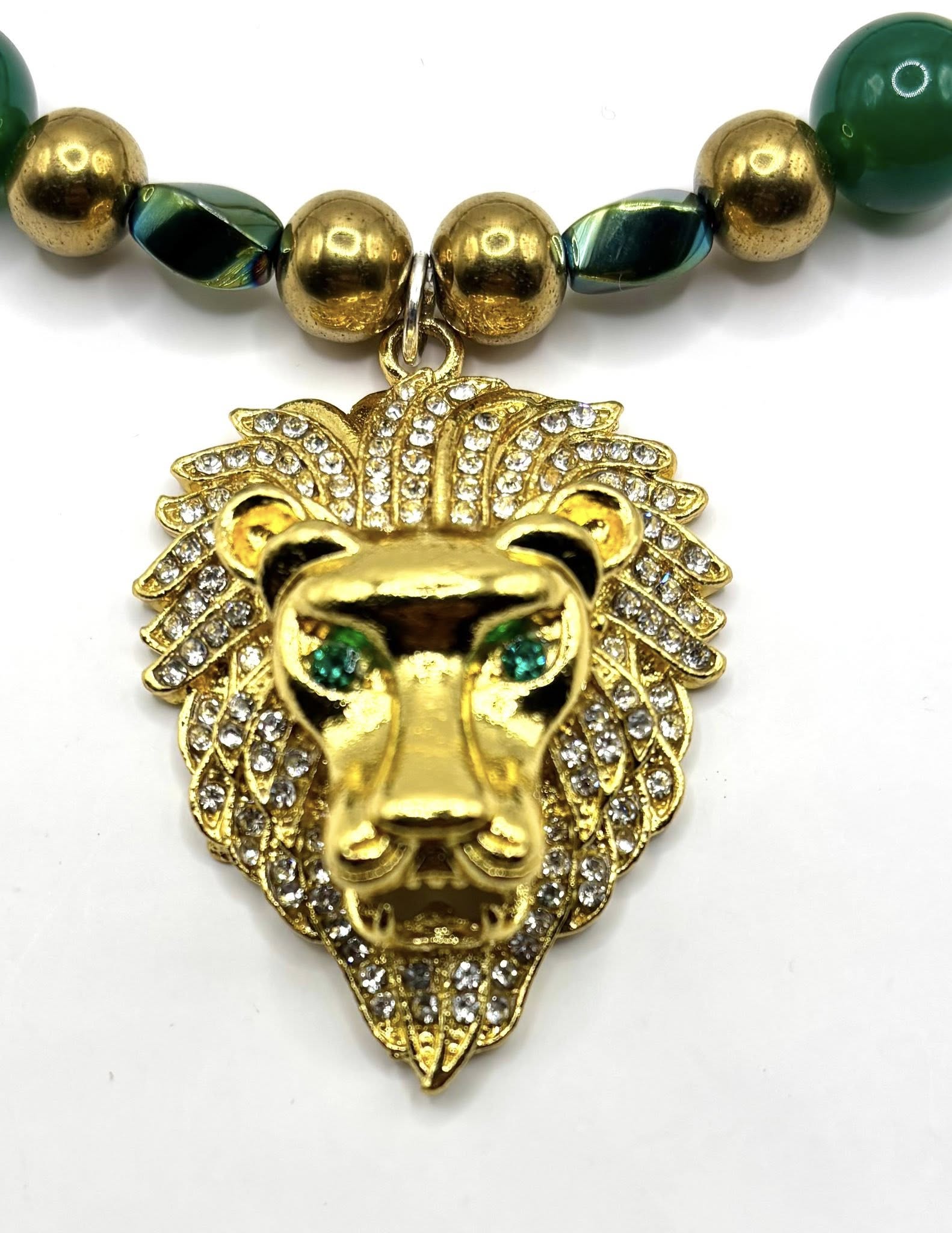 Step into your power with this handcrafted Lion Power Necklace, featuring deep green aventurine beads accented with gold-tone details and a striking lion head pendant. The lion symbolizes leadership, courage, and confidence, while aventurine promotes prosperity and inner balance — making this a true statement of strength and success.