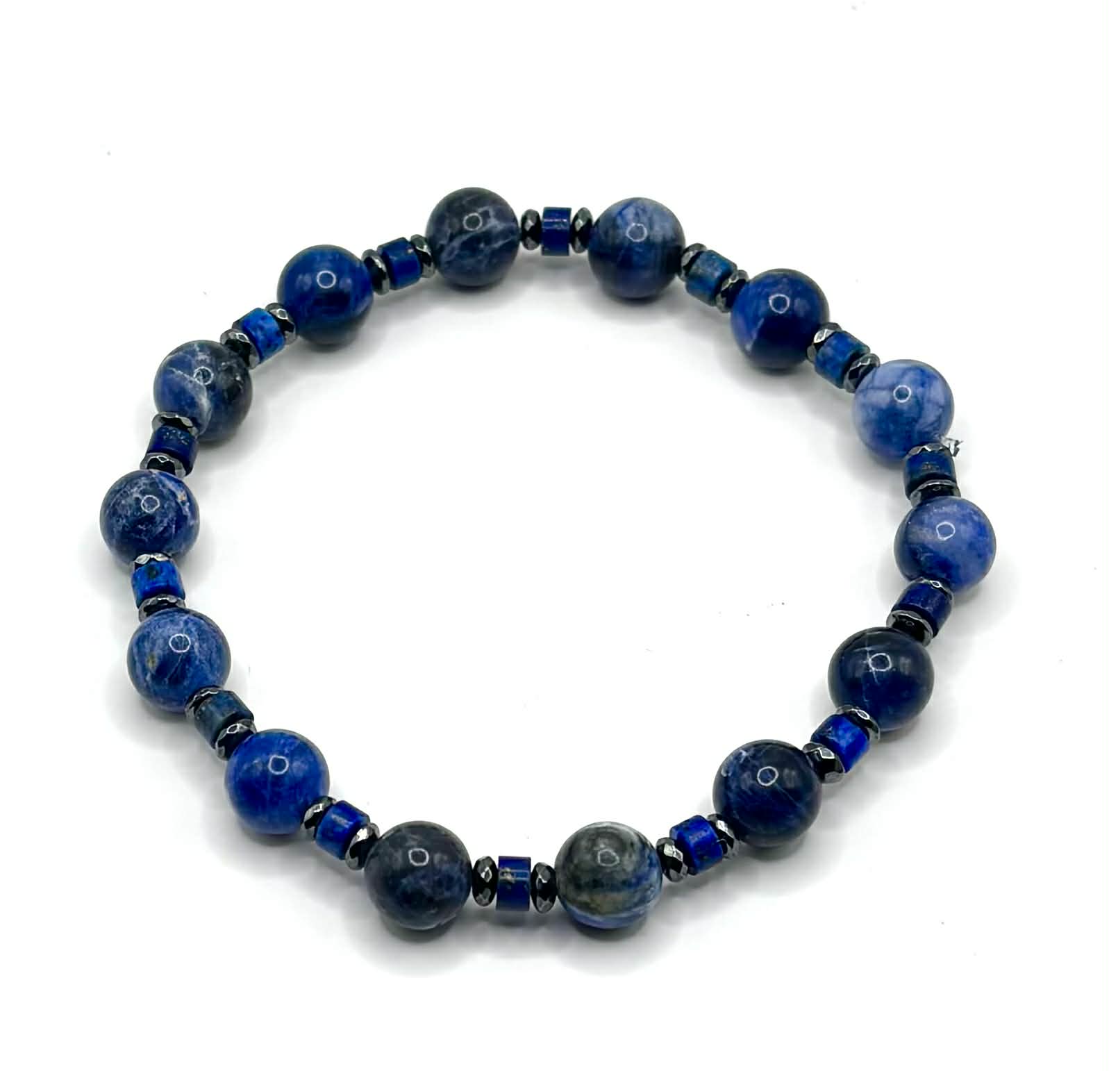 A sleek, handcrafted design made for both style and balance. Featuring rich Sodalite gemstones in deep midnight blue with natural white veining, this bracelet brings a powerful yet soothing energy. Sparkling blue crystal spacers and silver accents add a modern touch, enhancing the bracelet’s bold, polished look.