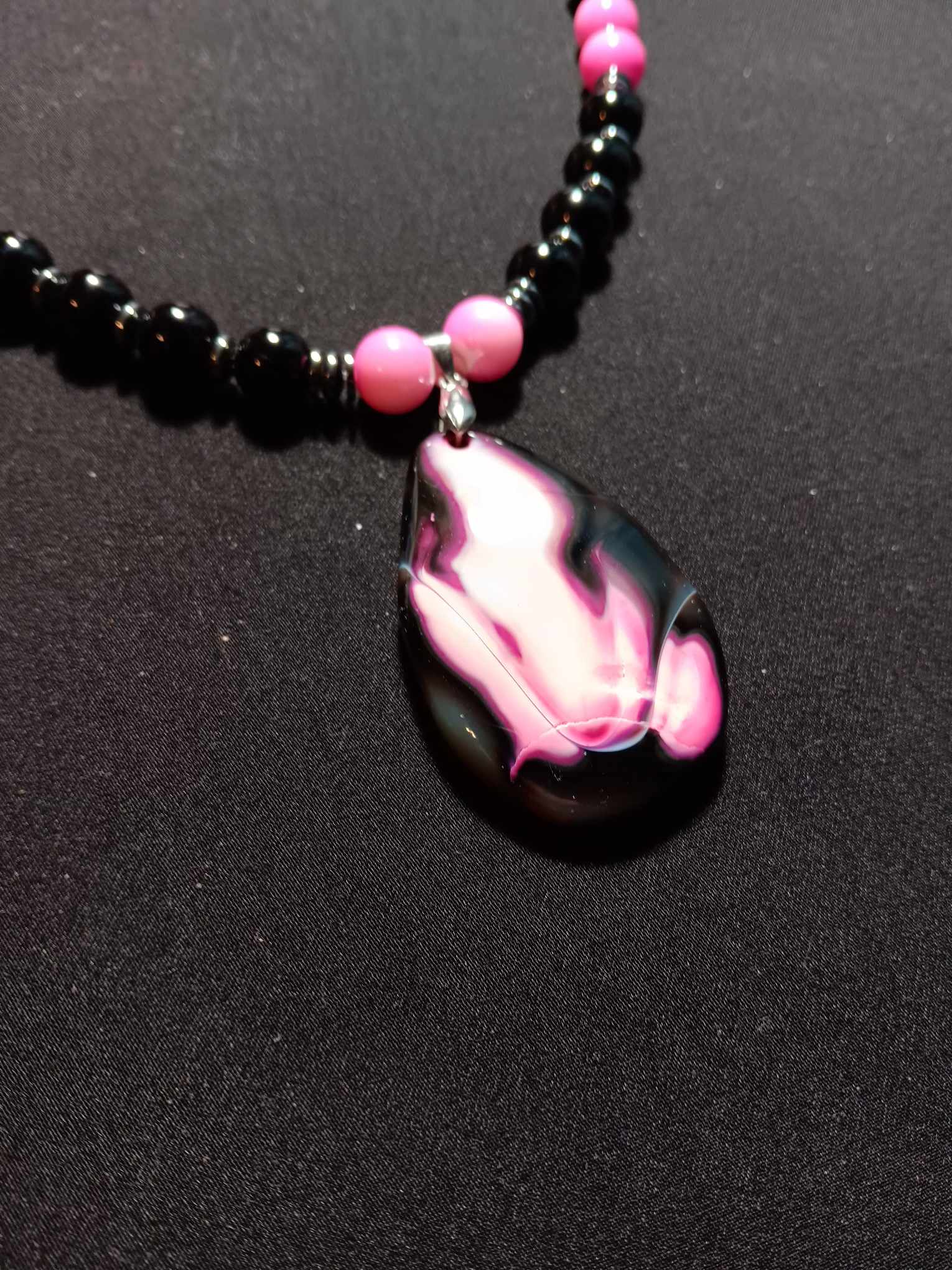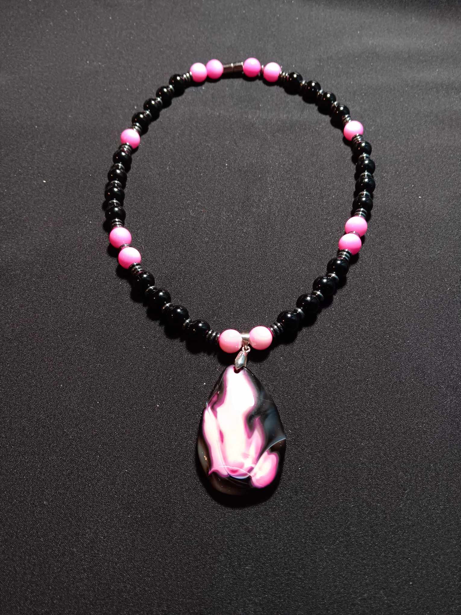 10mm Onyx and pink stone charm Necklace with magnetic closure