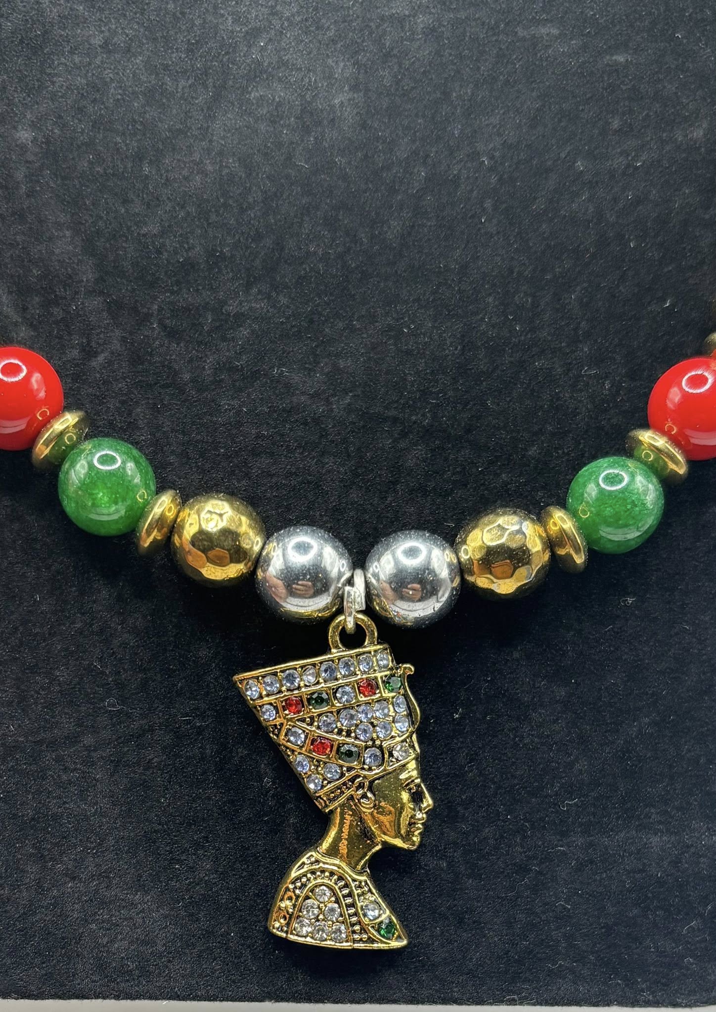 Celebrate heritage and empowerment with this handcrafted Pan-African Nefertiti Necklace, featuring bold red jasper, green aventurine, and hematite beads accented by gleaming gold details. The centerpiece — a radiant Queen Nefertiti pendant adorned with crystals — symbolizes beauty, wisdom, and divine royalty.