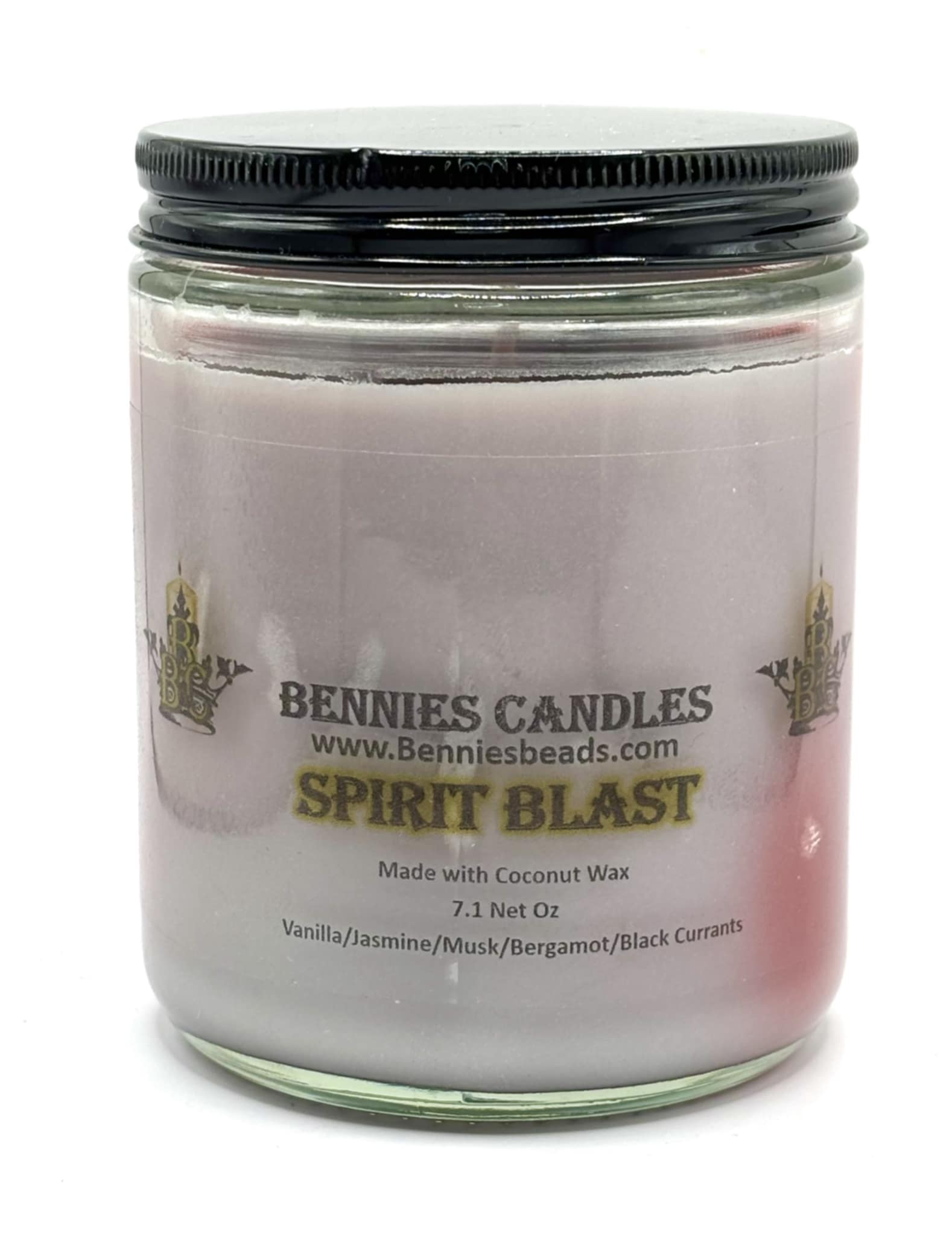 Spirit Blast – Feel a total body eruption when you take in this wonderful scent. As this aroma enters your nose and works its way deep into your spirit. This spiritual joy is infused with vanilla, Jasmine, musk, lemongrass, black currant, and bergamot. Fall victim to the pleasures of the spirit and the mind when you spend time with this Bennies Candles designer candle.