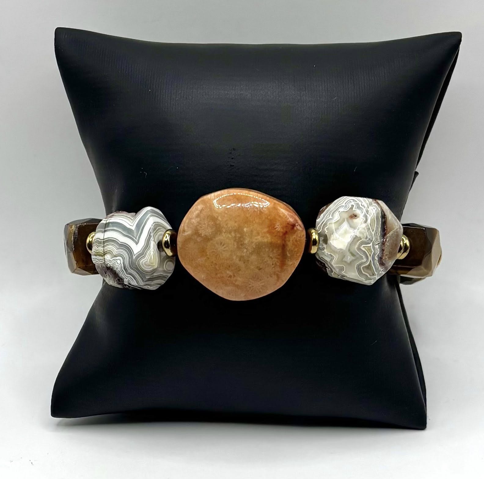 This handcrafted bracelet radiates earthy elegance with powerful Tiger’s Eye, Banded Agate, and Fossil Coral stones. Tiger’s Eye inspires courage and confidence, Banded Agate promotes stability and balance, and Fossil Coral carries the ancient energy of the ocean, symbolizing wisdom and transformation.
