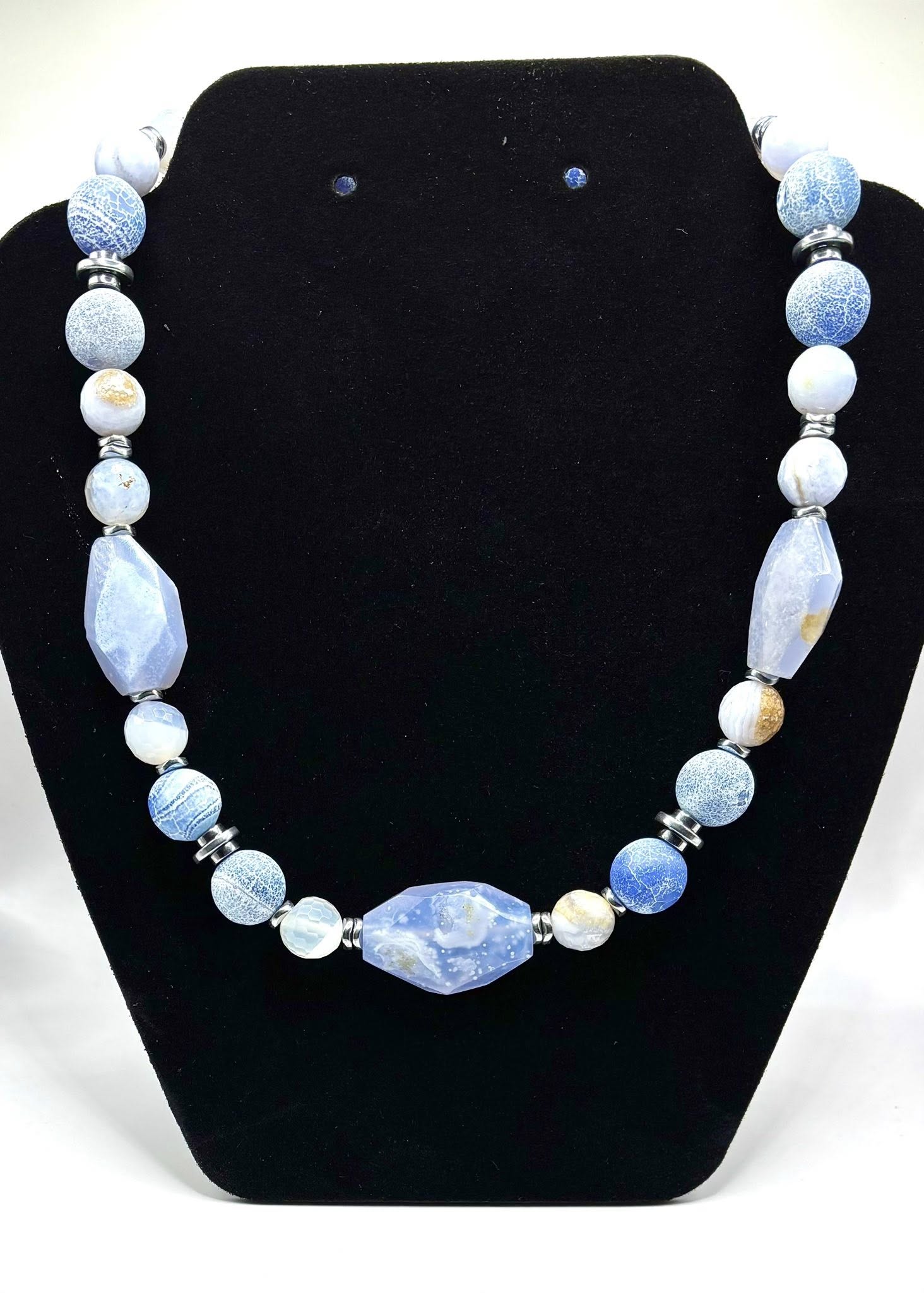 Each bead radiates serene shades of sky blue, soft gray, and ivory, reflecting peaceful energy and timeless beauty. The faceted Blue Lace Agate centerpiece represents clarity and calm communication, while the crackled agate beads add depth and texture, symbolizing strength and emotional balance.